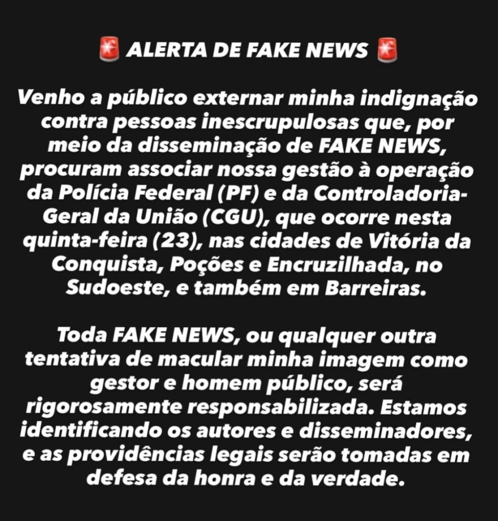 O prefeito de Barreiras, Otoniel Teixeira, se manifestou para desmentir informações falsas que circulam sobre seu suposto envolvimento na operação realizada pela Polícia Federal e pela Controladoria-Geral da União (CGU) em cidades baianas na última quinta-feira, 23.