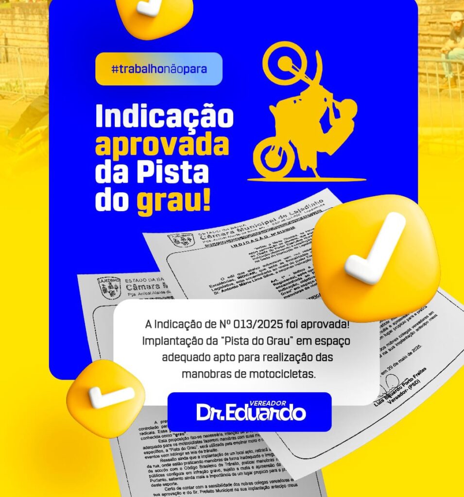 Nos últimos meses, Dr. Eduardo Porto intensificou o apoio a projetos que fortalecem políticas públicas e atendem demandas importantes dos moradores. Entre as iniciativas recentes, a que ganhou maior repercussão foi a indicação apresentada para a implantação da Pista de Grau em Lajedinho. A proposta tem como objetivo oferecer um espaço seguro e adequado para a prática do esporte, que conta com grande participação de jovens e adultos da cidade.
