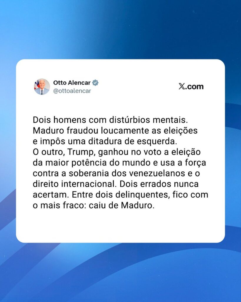 O senador Otto Alencar (PSD-BA) se manifestou sobre a ação militar dos Estados Unidos que resultou na prisão do presidente da Venezuela, Nicolás Maduro, no último sábado (3). Em publicação nas redes sociais, o parlamentar fez críticas duras tanto a Donald Trump, que teria ordenado a ofensiva, quanto a Maduro, a quem atribuiu práticas autoritárias e antidemocráticas.